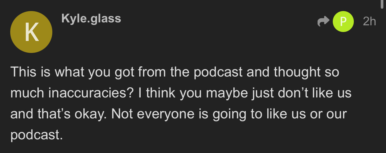 This is what you got from the podcast and thought so much inaccuracies? I think you maybe just don’t like us and that’s okay. Not everyone is going to like us or our podcast.