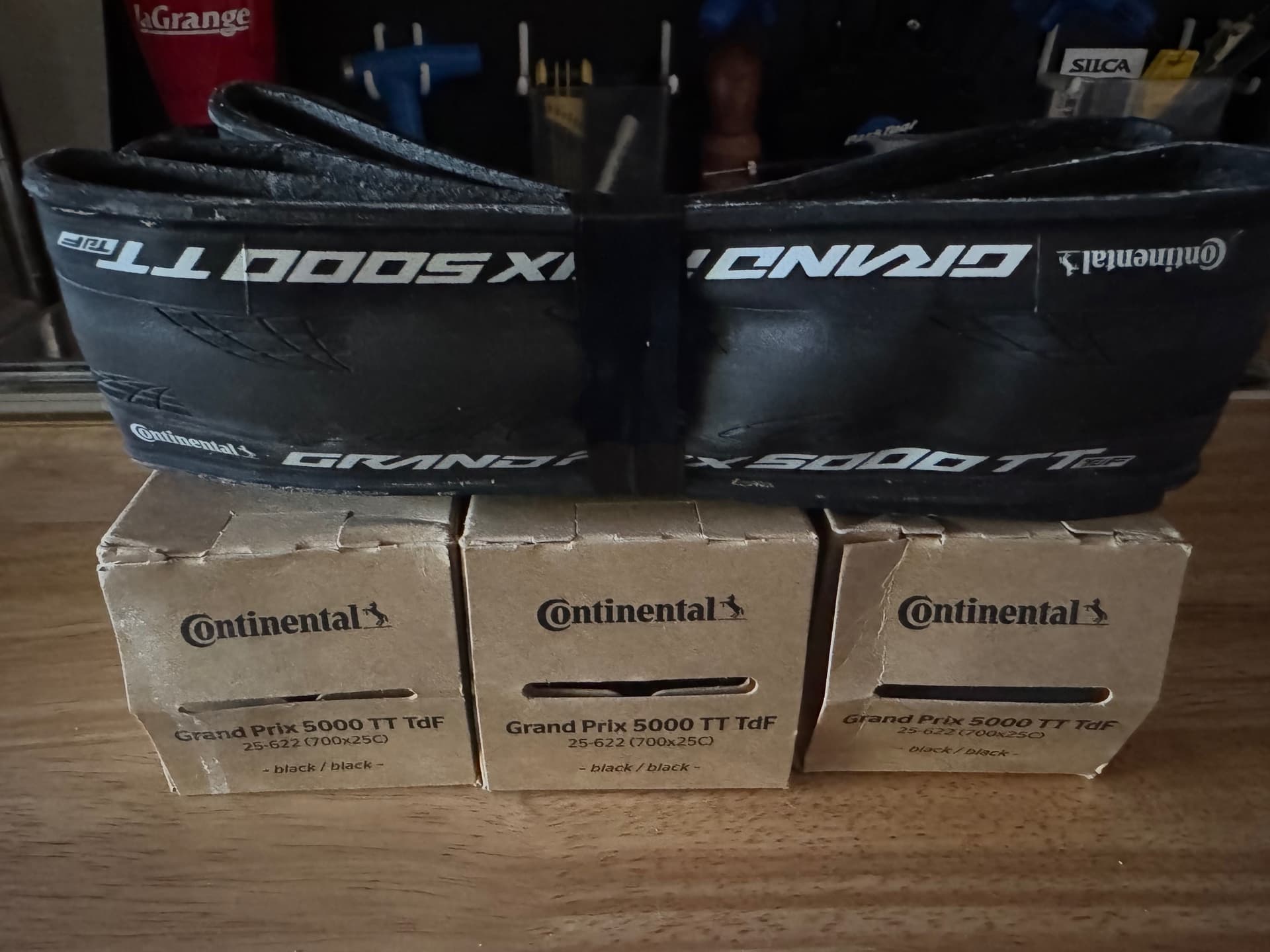 TdF edition. All 25c. One tire was mounted on a front wheel but never ridden. Other three are new in box. $200 shipped.