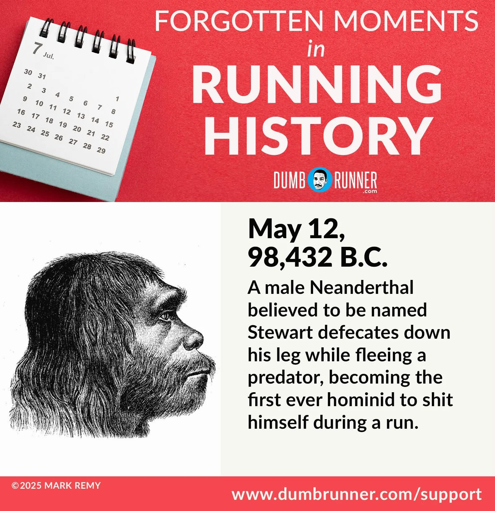 Rumor has it he’s the original ancestor of Taylor Knibb who also shat herself while fleeing from a predator of a different kind in Dubai approximately 100,000 years later.