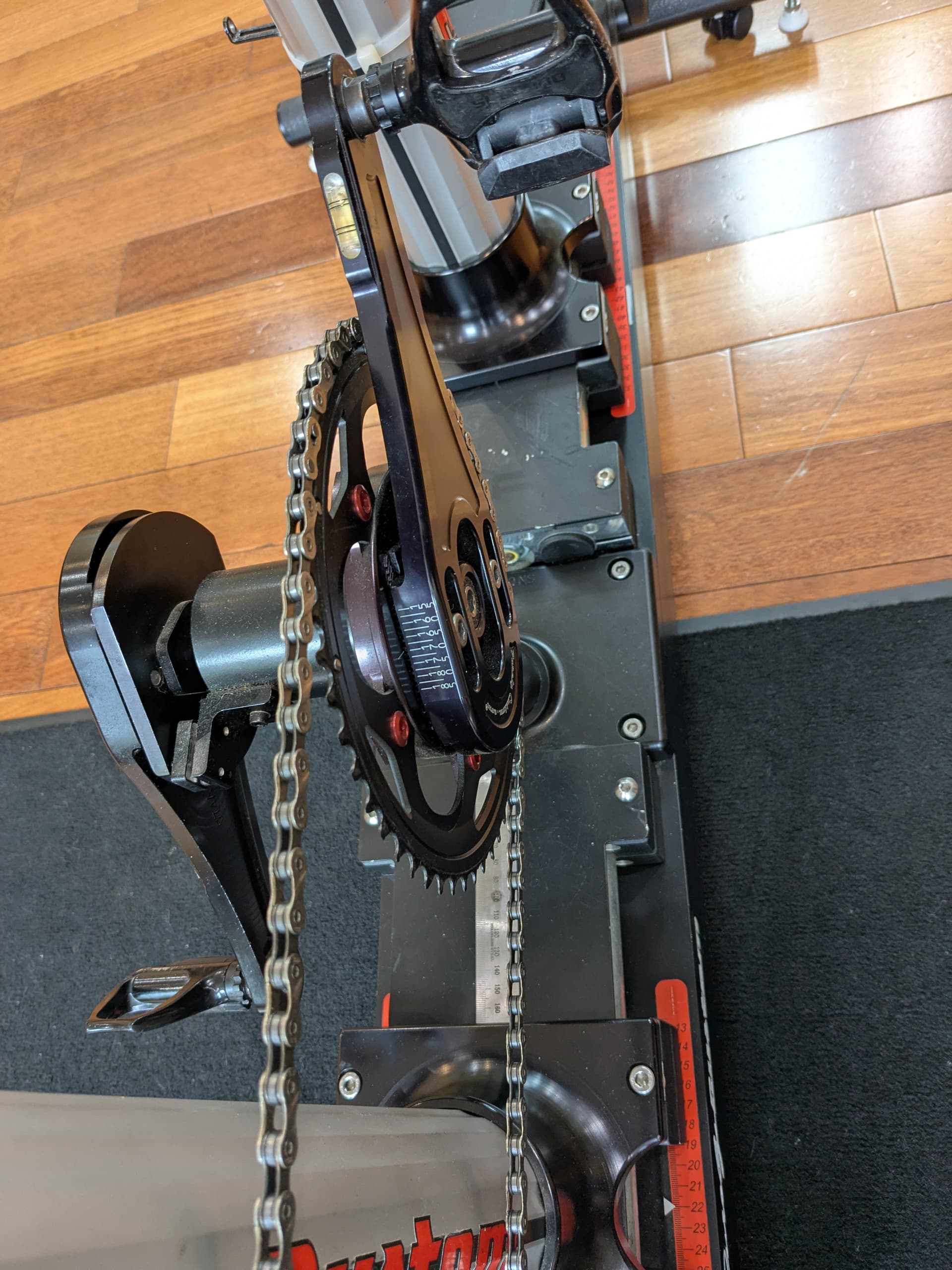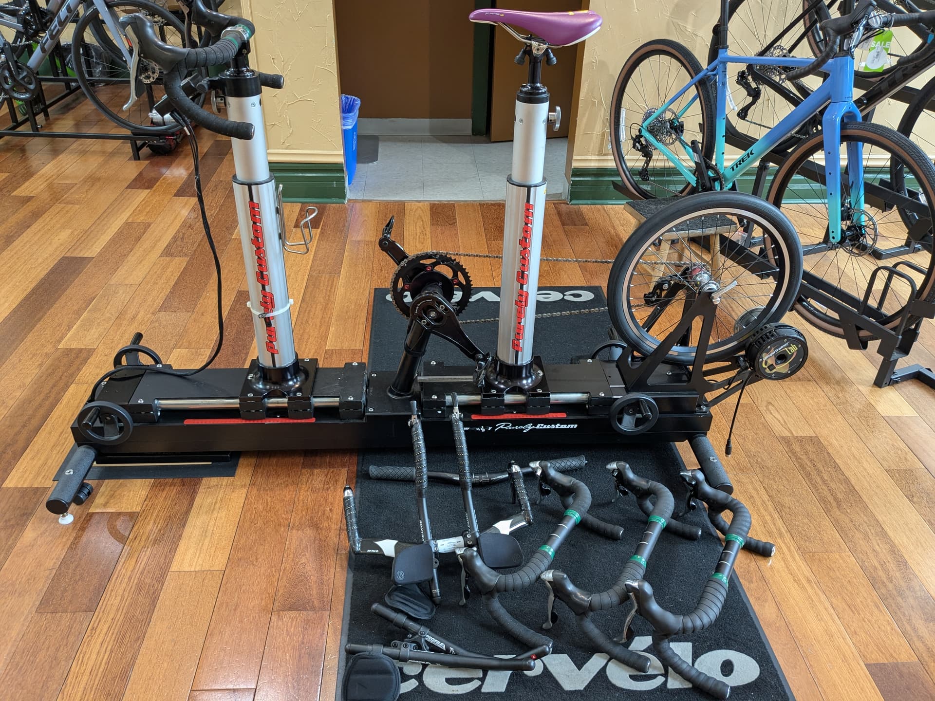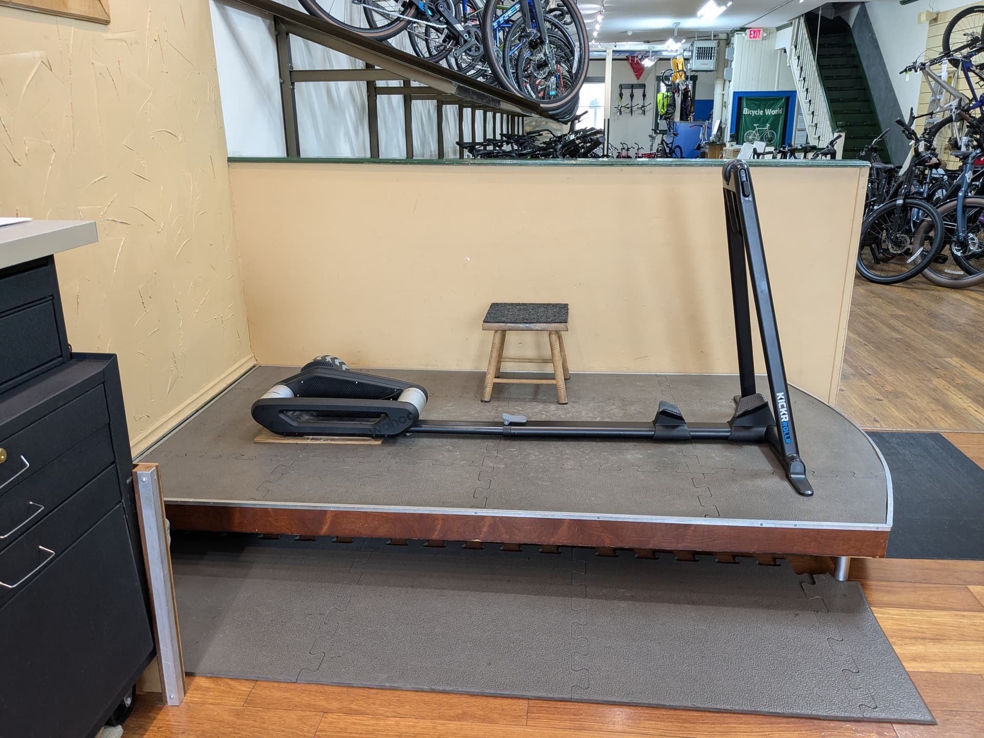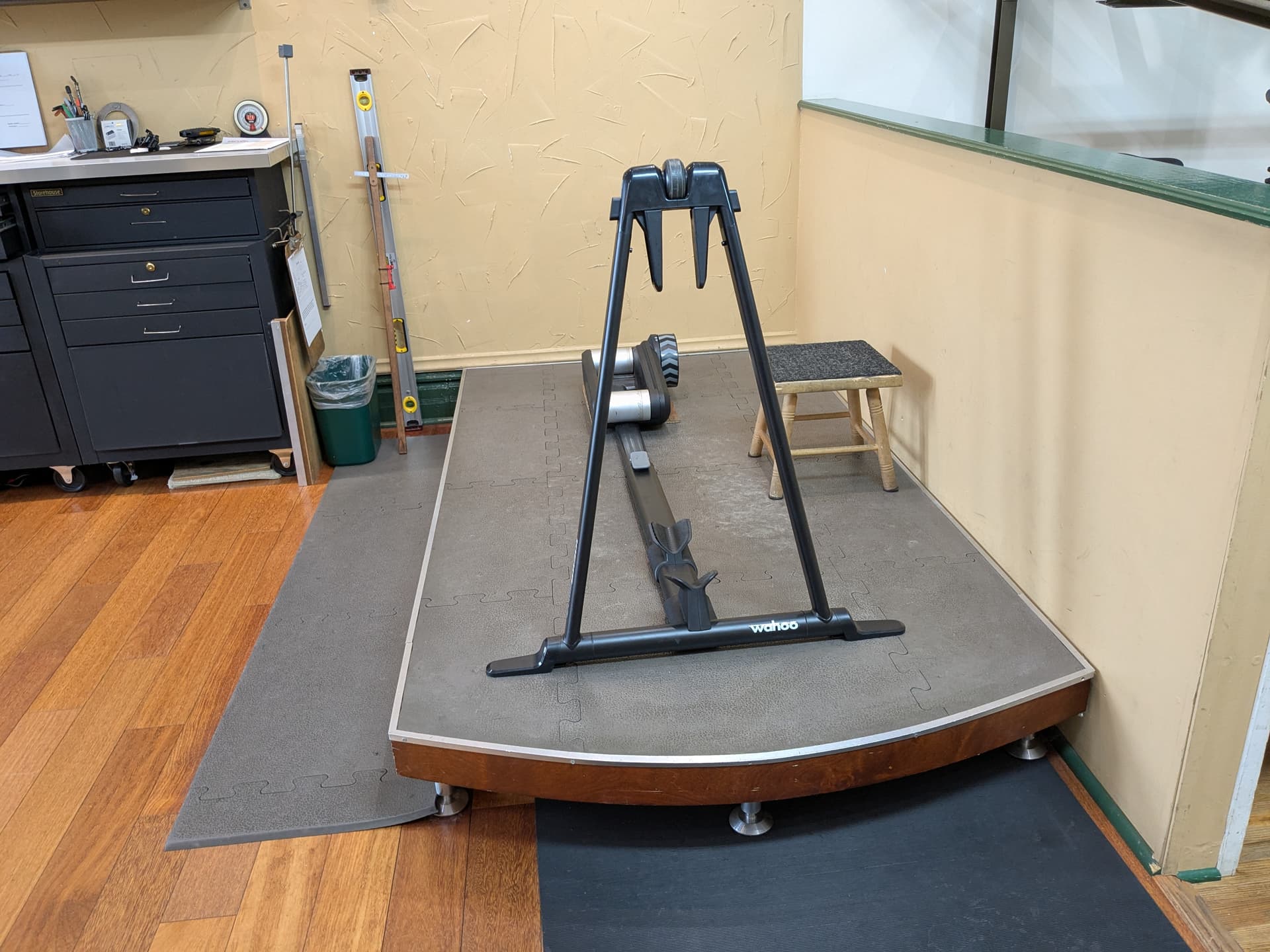 The fit stage is a stressed-skin structure, like a hollow-core door. It is very stiff but less heavy. It has machined aluminum adjustable levelling feet under it. Accepts tandems too. Will accept any trainer on top but the included Wahoo roller has been our favorite for most situations, except for big mountain tires. Stage has a rubber top and we will include the surrounding walking surfaces for rider safety. Carpeted step stool included which is very handy for riders who lack lateral leg mobility. 1500$.
