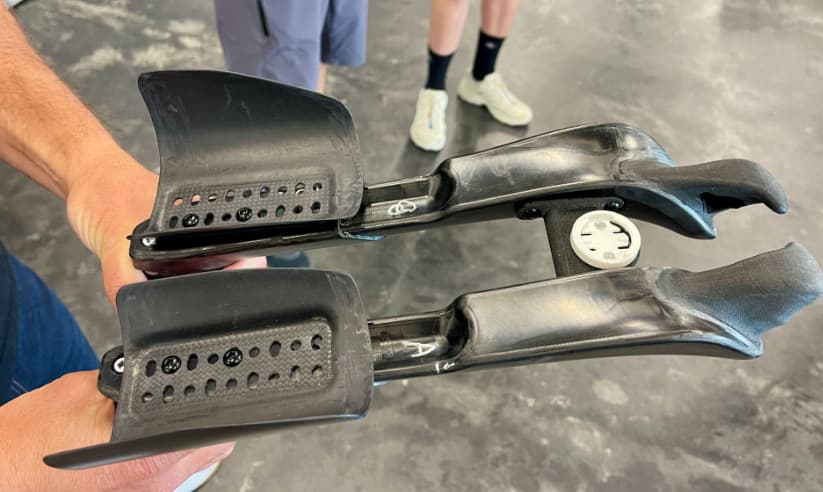 Enve, 3 piece design. Clamps that holds the aero profiled extension and then a carbon cup attached above it. See pics below, Vrs Look, full arm support design with adjustable length overlapping aero profiles.