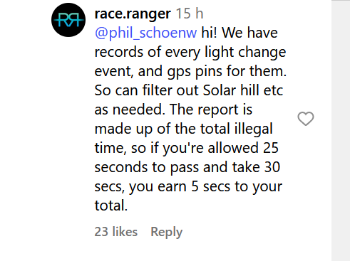 I would expect within some years this RR data to be used as sorta an eye in the sky catch all penalty, where if you didn’t get it on the road by an official, they will penalize you on the run. If this really does work, this is essentially the ah ha moment of making this truly what the sport was meant to be…Ride to the rules whether an official is physically with you or not. Now we basically will have all pro’s riding with an unofficial official imo…