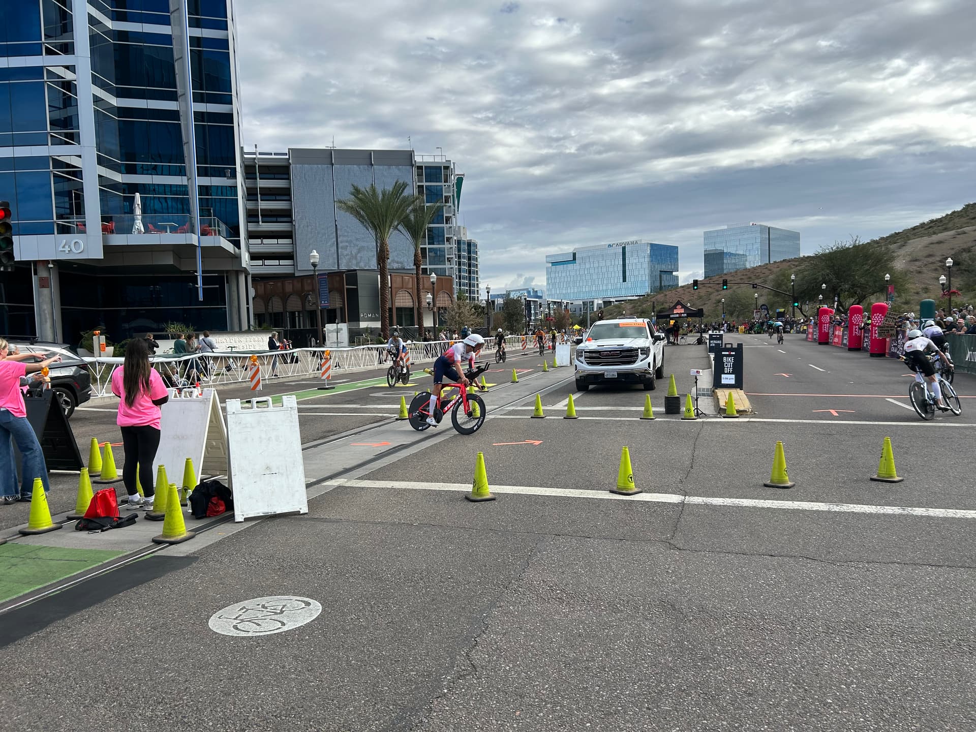 Half way done and we still have a lead pack of 4. The Long chase group has now swallowed Mc and is 7 strong 3:57 back. Foley is charging to make that chase group only 22 seconds off the back of group, should catch by the next timing mat. He has been the big mover making up 1 min on the lead, did he burn his biscuits to get to the chase group? If he’s smart he’ll settle in behind them for a bit and enjoy the draft.