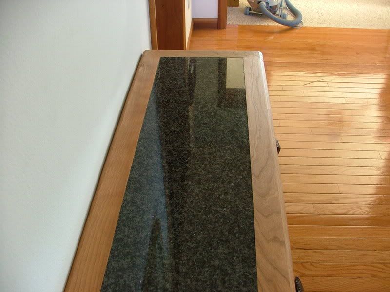 I’ll start. I just finished a wedding present for my sister and her husband (it’s a little late, but that’s is another story). It is made mostly out of cherry. The top has a granite slab surrounded by a cherry frame that has walnut splines in the mitered corners.