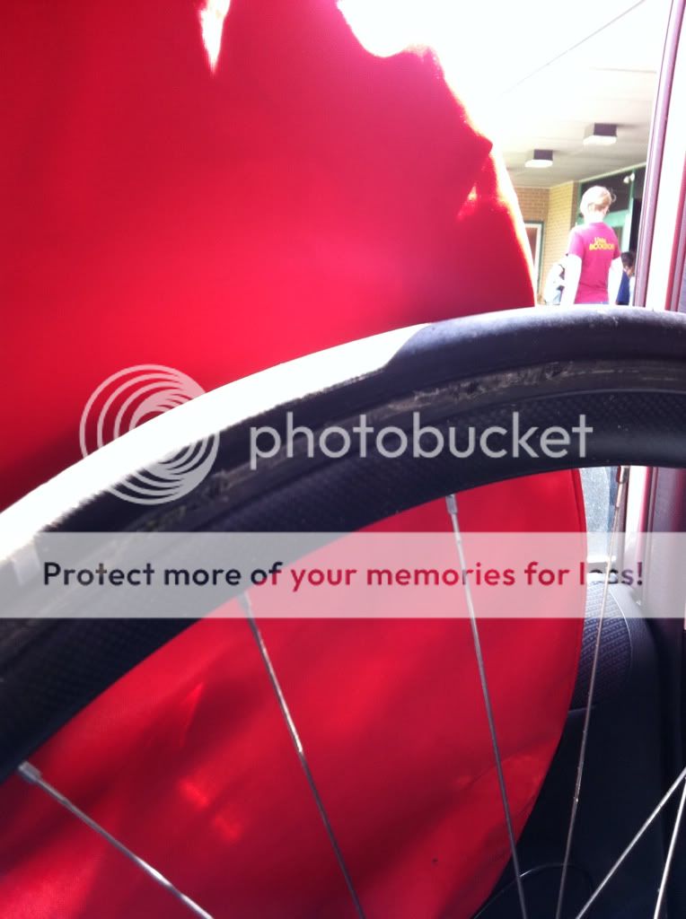I had a rear failure on a set of 38 CCs on a long descent that was part of a neutral roll out for the start of a race. Because of this everyone is going slow and if you have the wrong pads on and carbon clinchers you run into trouble. Looks like every year the guys with failures are running swiss stop yellows. I was fortunate enough to have a set on my ride and the rear pad melted and brake surface delaminated.