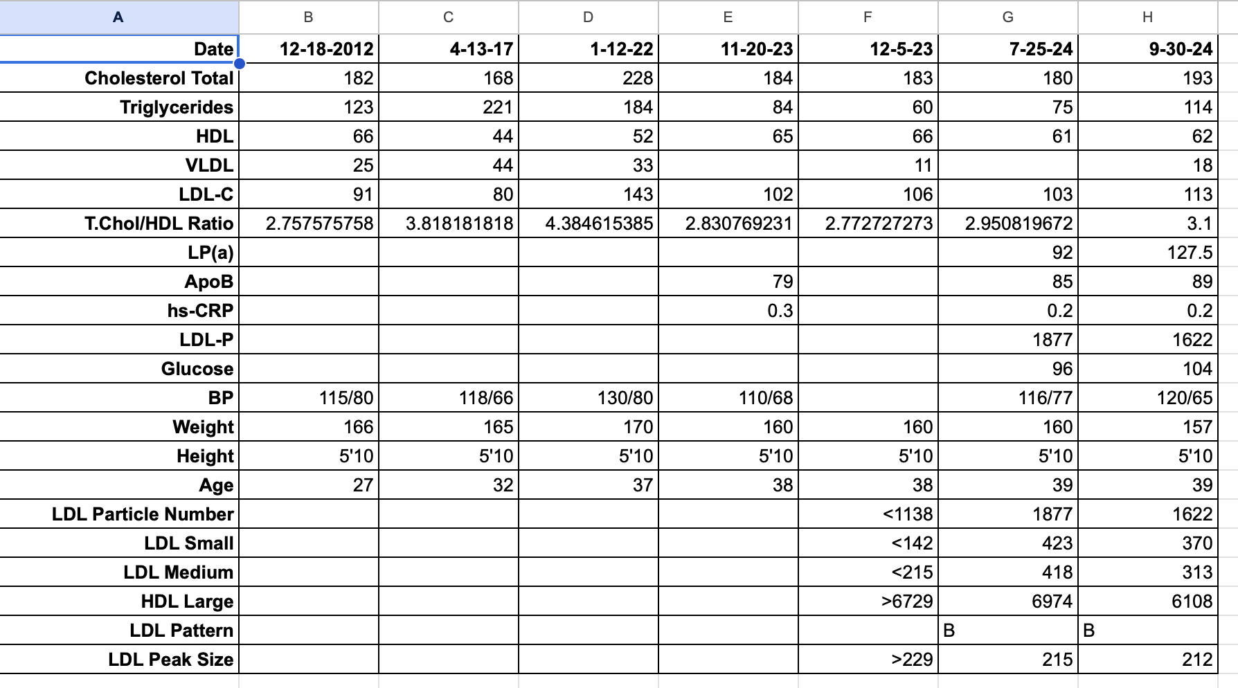Recently, I made even more dietary improvements by cutting out most saturated fats for six weeks (no dairy, cheese, red meat, etc.). Despite that, my latest results surprised me: 193 total cholesterol, 114 triglycerides, 113 LDL, and my Lp(a) rose to 127.5 nmol/L. Additionally, I have abnormal LDL particle numbers, especially small particles, and my glucose slightly increased to 104. My CAC score is 0, and I’m scheduled for a heart stress test and carotid artery ultrasound soon.